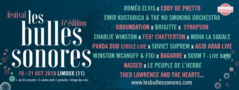 La 6e édition du festival les Bulles Sonores vous donne rendez-vous le premier week-end des vacances d’automne, du vendredi 19 au dimanche 21 octobre à Limoux. Plus de 20 concerts de musiques actuelles sont programmés pendant ces 3 jours : Brigitte, Eddy de Pretto, Synapson, Emir Kusturica, Charlie Winston, Roméo Elvis, Feu! Chatterton, Panda Dub, Le Peuple de l’Herbe, Groundation…et bien d’autres artistes sur les 3 scènes du festival !