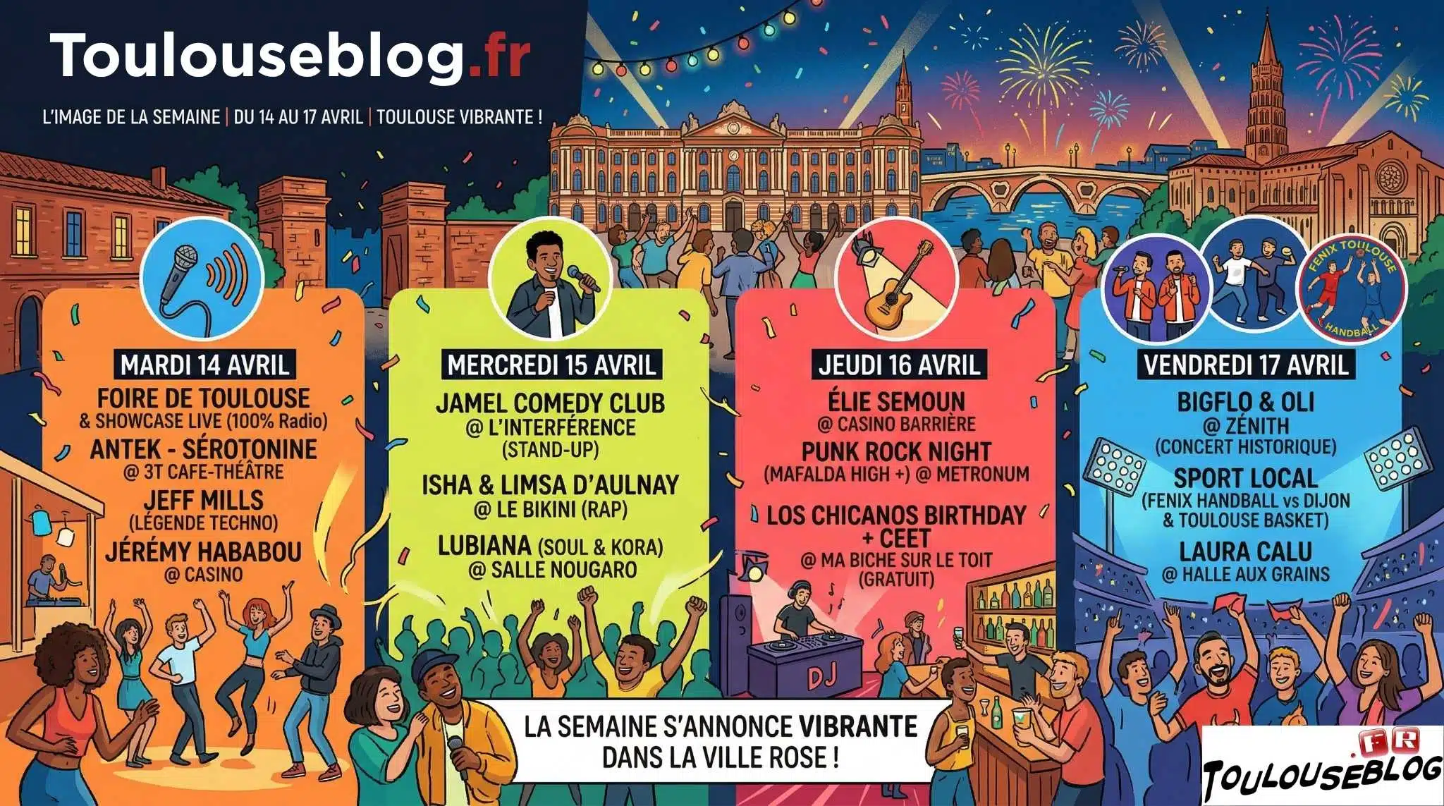 La semaine s’annonce particulièrement vibrante dans la Ville Rose ! Que vous soyez d’humeur à rire, à vibrer au rythme de la musique ou à donner de la voix pour soutenir nos équipes locales, le programme de ce milieu de mois d’avril est chargé. Voici notre sélection des sorties incontournables pour rythmer vos journées et vos soirées, du mardi au vendredi.